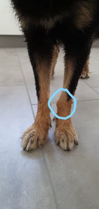 Layla's Pfote vor der Behandlung, ein dicker Knorpel hat sich gebildet und die Pfote war krumm.